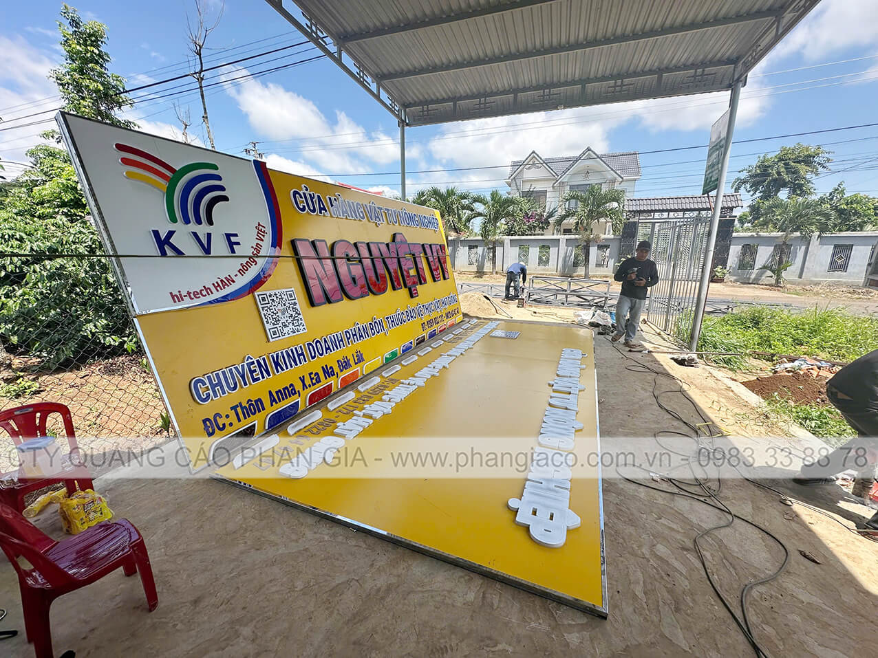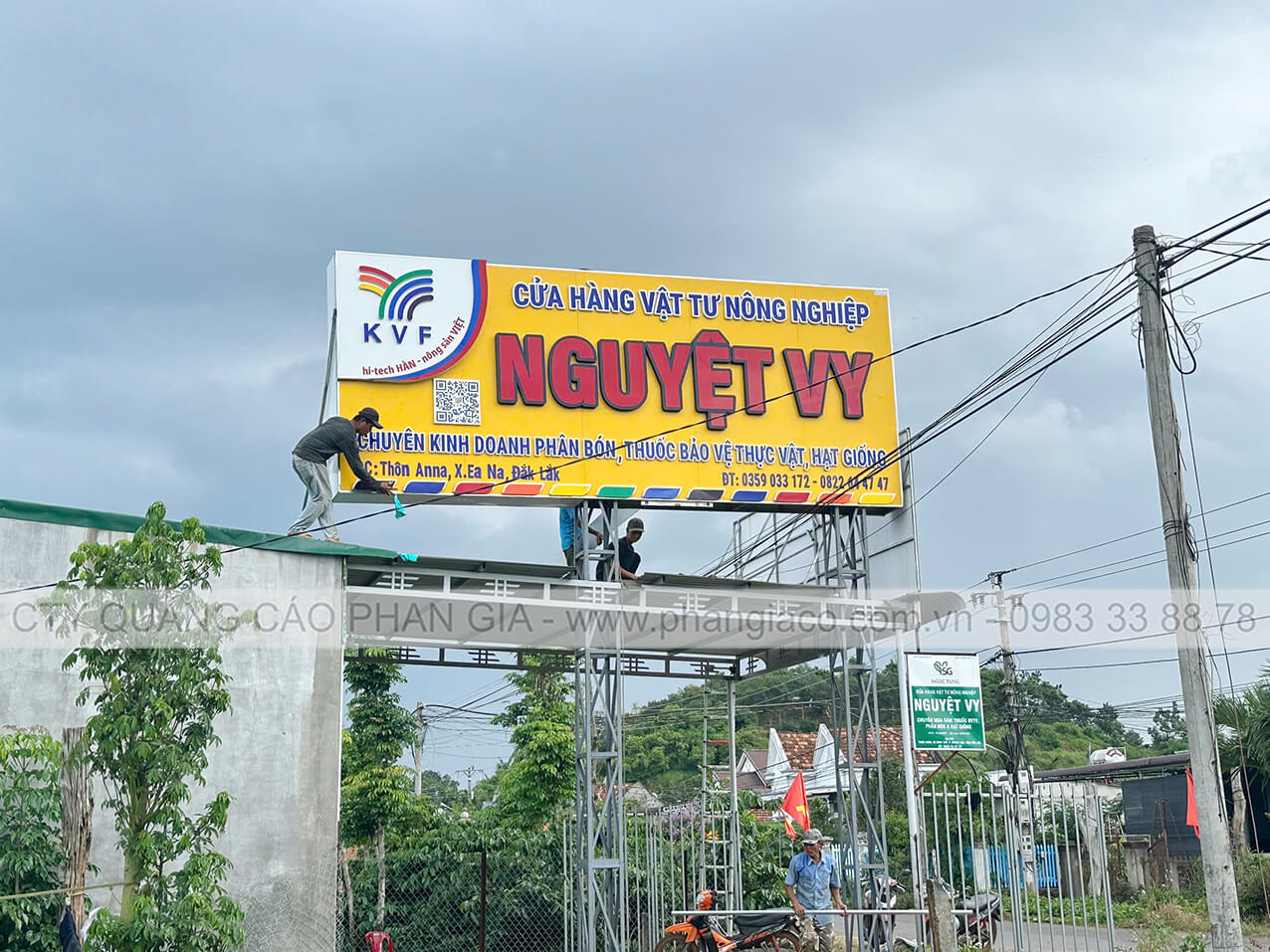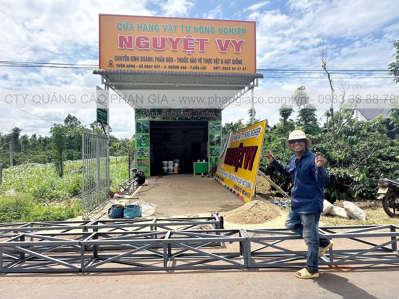 Pano quảng cáo cửa hàng vật tư nông nghiệp Nguyệt Vy được anh em thợ thi công Phan Gia hoàn thiện, nghiệm thu và bàn giao cho cửa hàng đưa vào sử dụng tại tỉnh Đắk Lắk