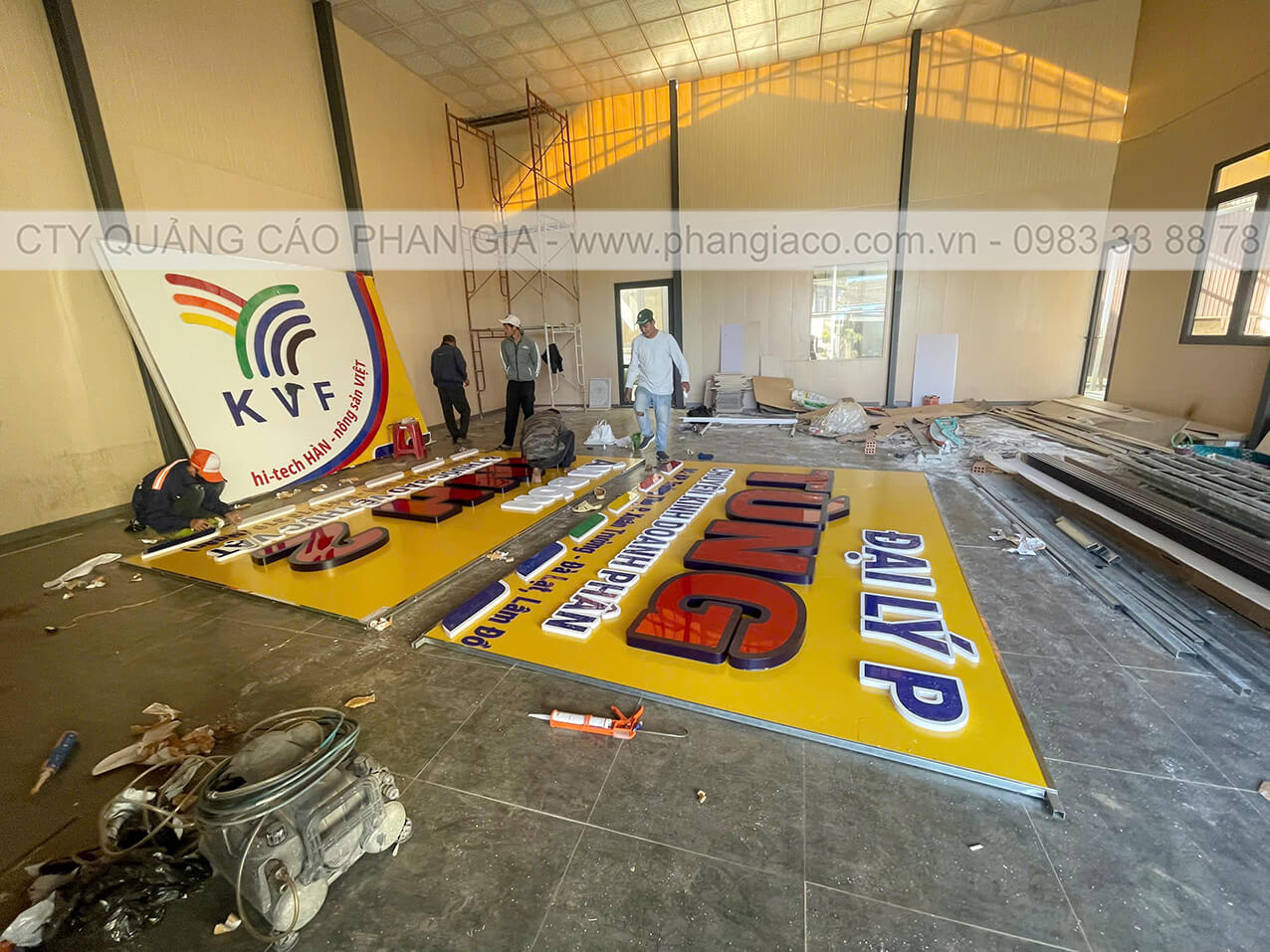Bảng hiệu aluminium đại lý phân bón được gia công, sản xuất hoàn thiện tại xưởng Phan Gia từ khung sắt, ốp alu, chữ mica nổi, vận chuyển lên đại lý lắp ghép thành bảng hiệu nhôm hoàn chỉnh trước khi tiến hành lắp đặt