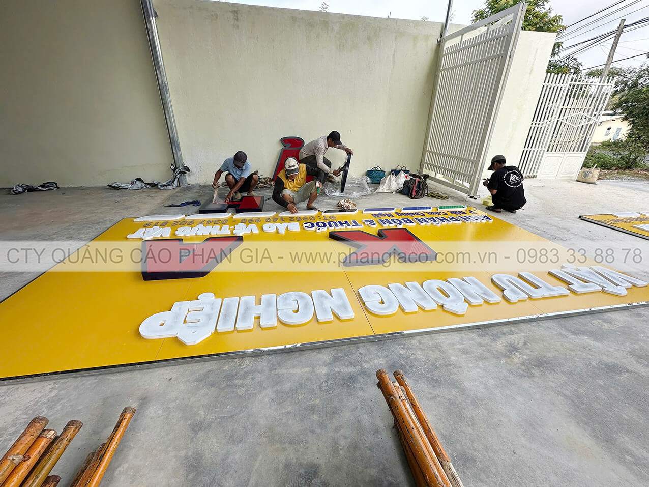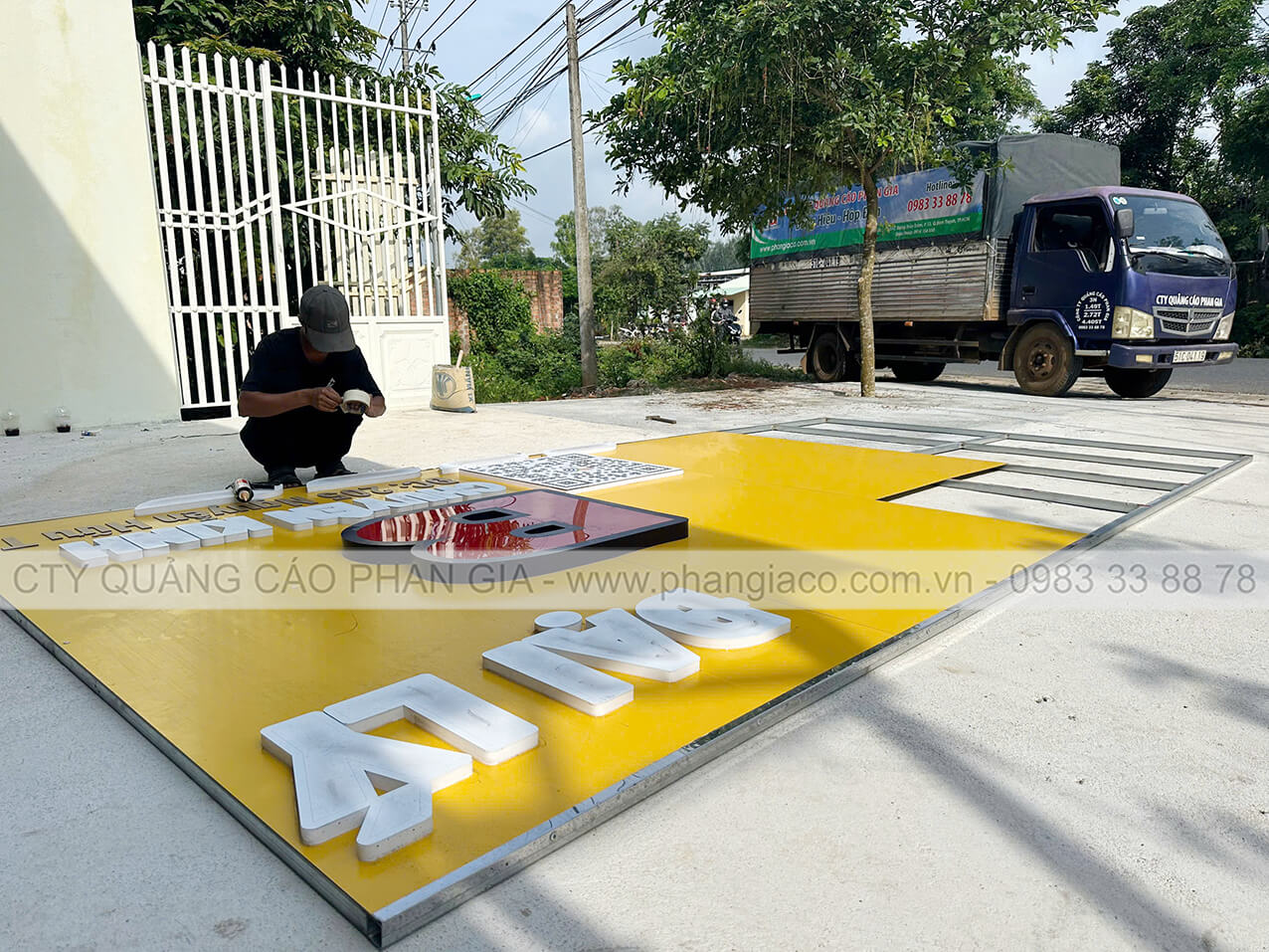 Lắp đặt modul logo alu, hàn liên kết kiên cố logo với khung bảng, gia cố sắt chống phía sau đảm bảo an toàn của bảng trong suốt thời gian bảo hành và trong mùa mưa bão