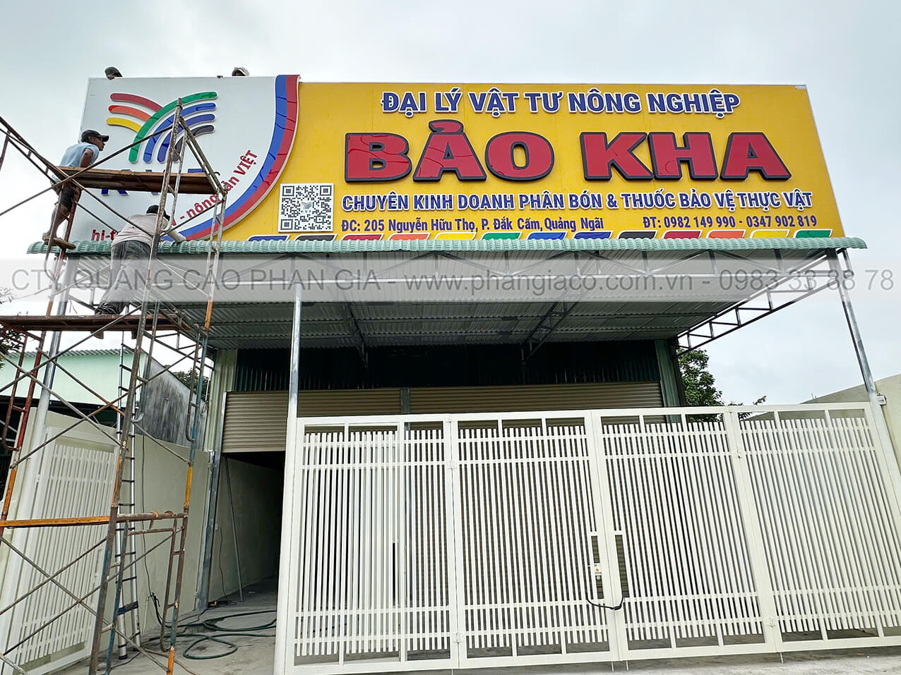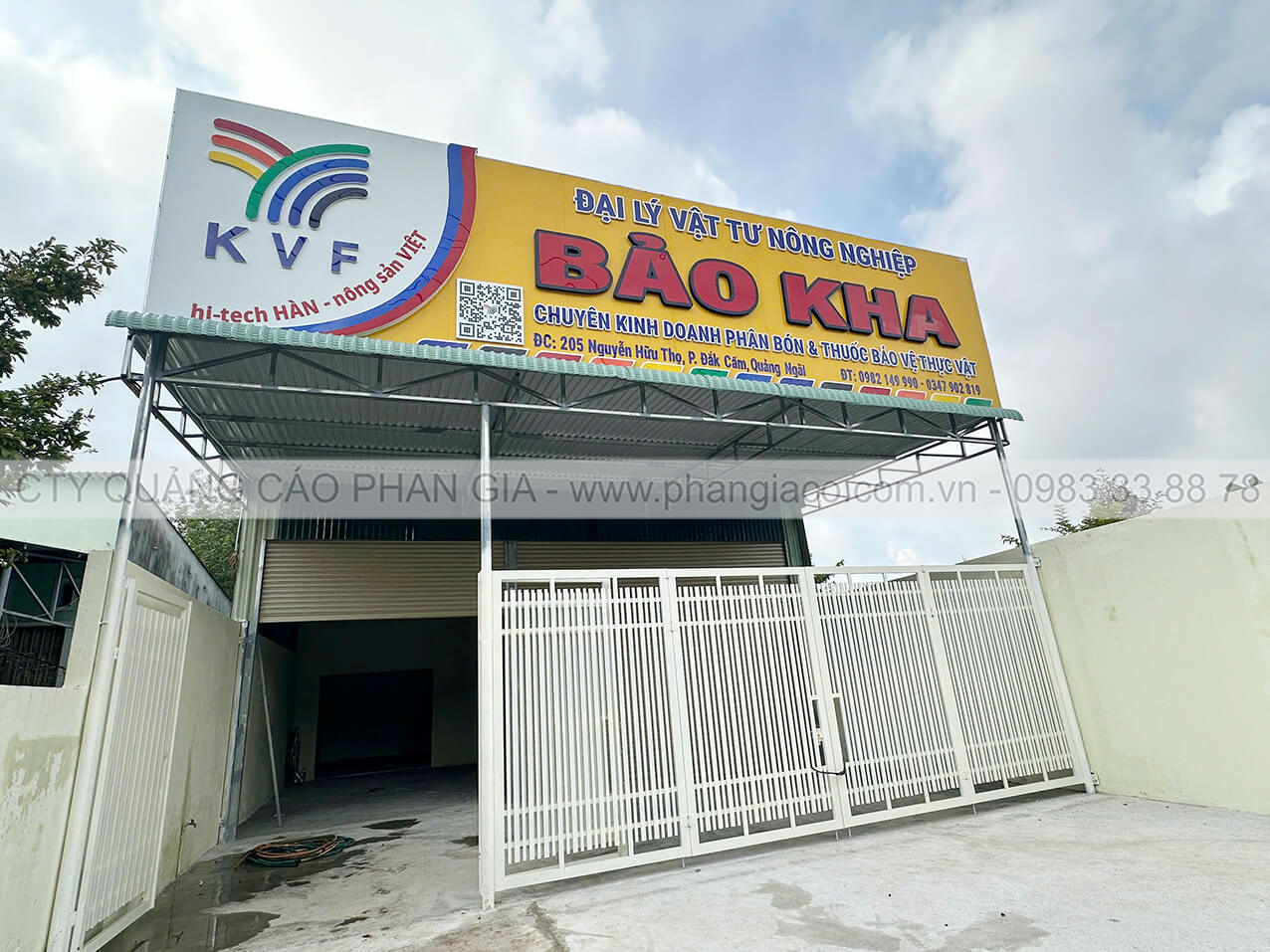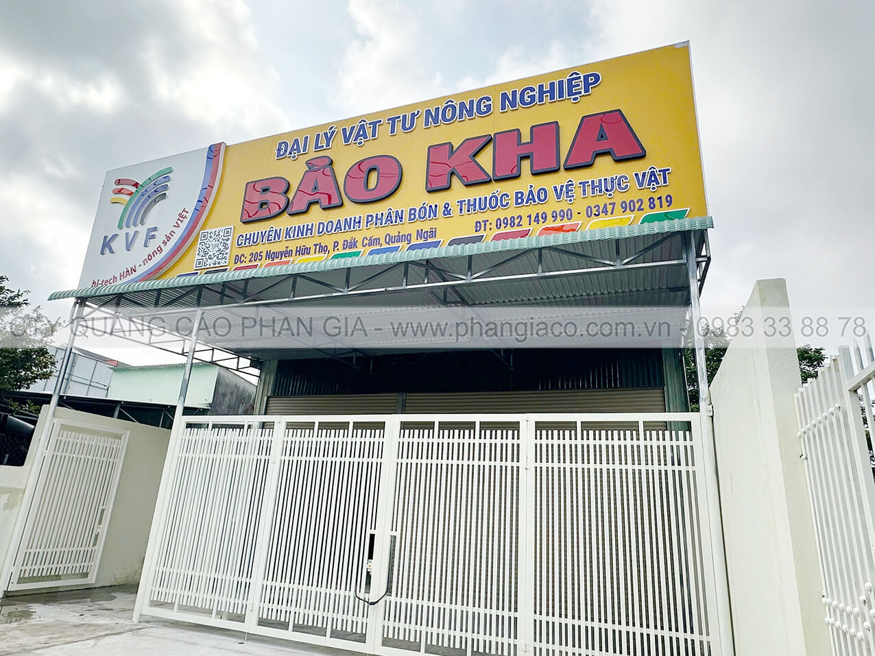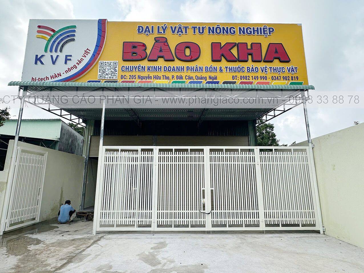 Bảng hiệu quảng cáo đại lý vật tư nông nghiệp Bảo Kha - đại lý phân bón cấp 1 NPK Hàn-Việt được Quảng Cáo Phan Gia khảo sát, thiết kế, sản xuất, vận chuyển & lắp đặt tại đường Nguyễn Hữu Thọ, TP. Kon Tum (nay là P. Đắk Cấm, tỉnh Quảng Ngãi). Một số hình ảnh thực tế tại đại lý của anh em thợ thi công Phan Gia.