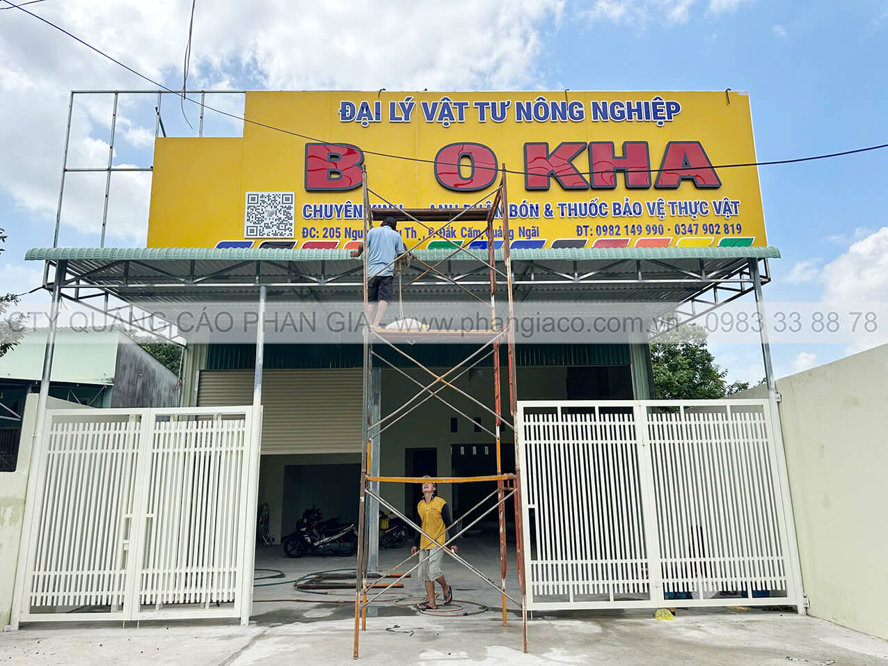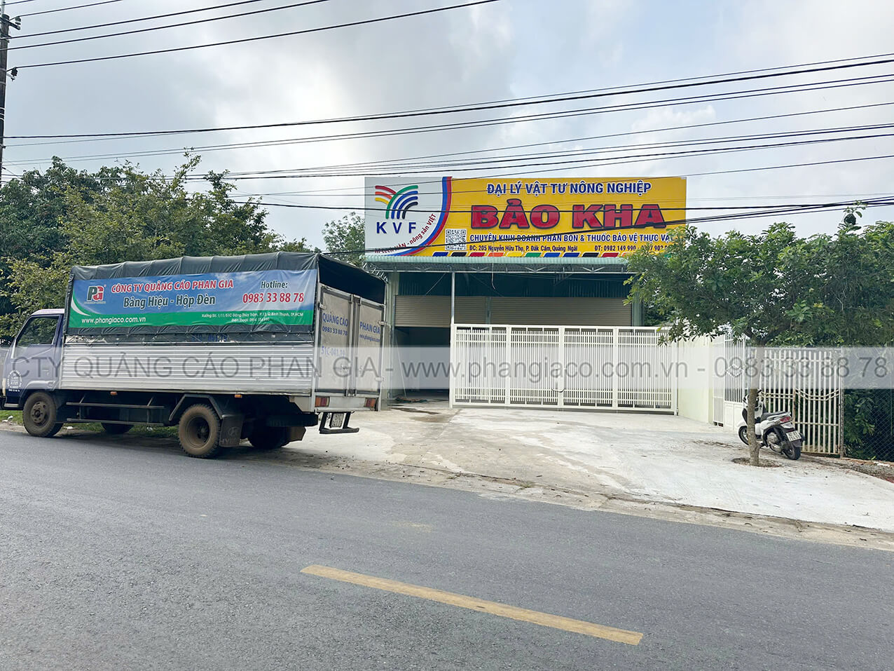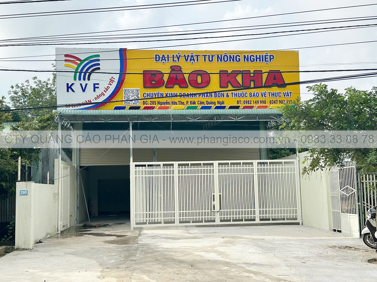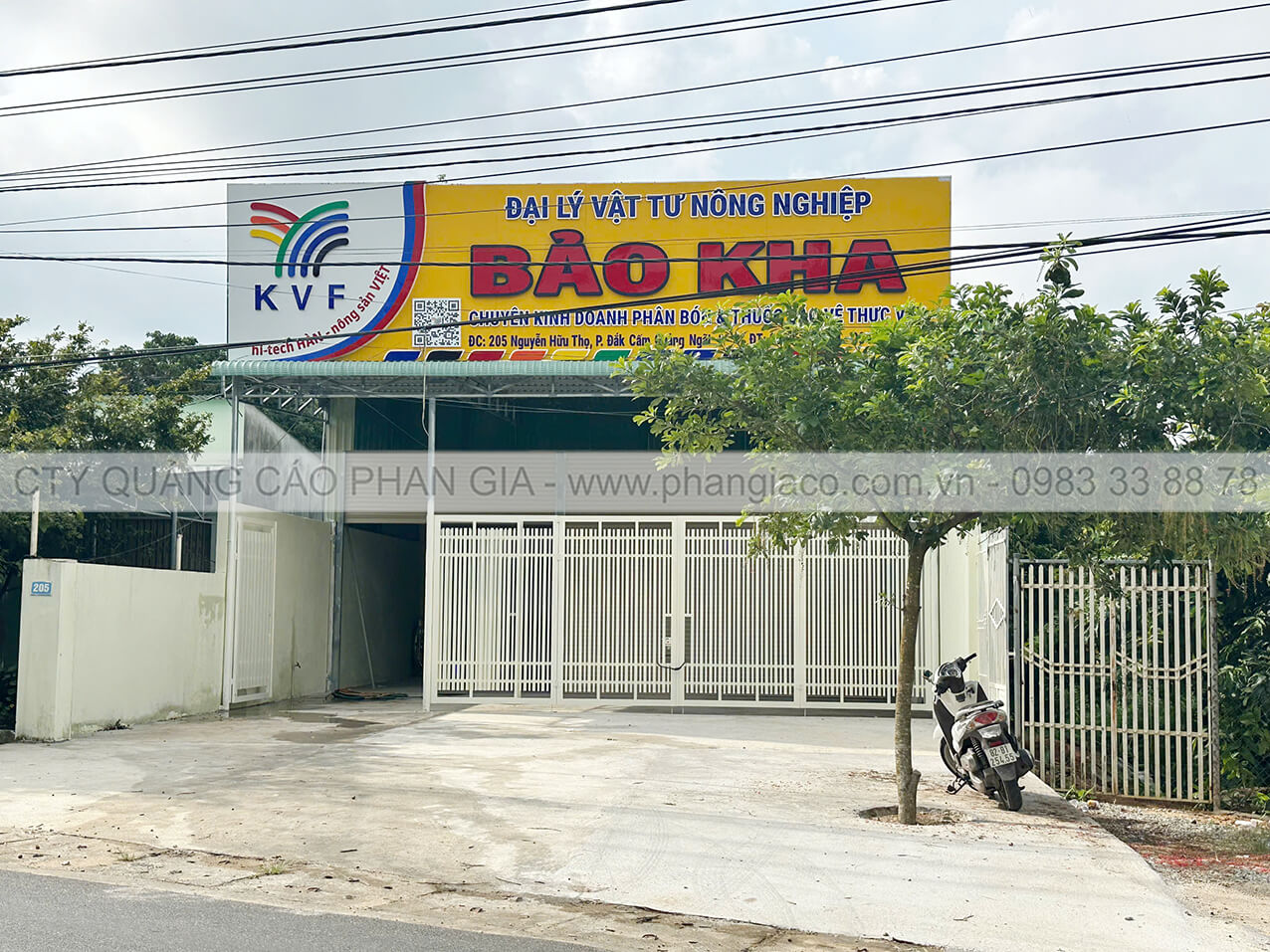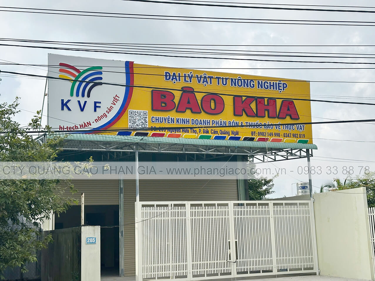 Bảng hiệu quảng cáo đại lý vật tư nông nghiệp Bảo Kha - đại lý phân bón cấp 1 NPK Hàn-Việt được Quảng Cáo Phan Gia khảo sát, thiết kế, sản xuất, vận chuyển & lắp đặt tại đường Nguyễn Hữu Thọ, TP. Kon Tum (nay là P. Đắk Cấm, tỉnh Quảng Ngãi). Một số hình ảnh thực tế tại đại lý của anh em thợ thi công Phan Gia.