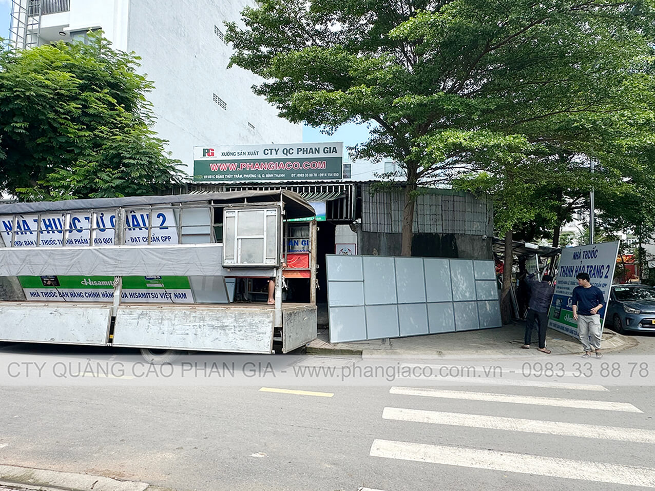 Hình ảnh bảng hiệu tôn decal nhà thuốc được sản xuất hoàn thiện tại xưởng PG, xếp bảng lên xe tải vận chuyển đến điểm lắp đặt tại P. Ngã Bảy, TP. Cần Thơ (thuộc TP. Ngã Bảy, Hậu Giang cũ)