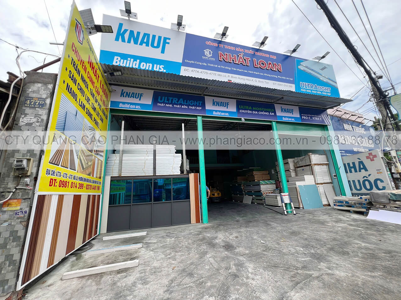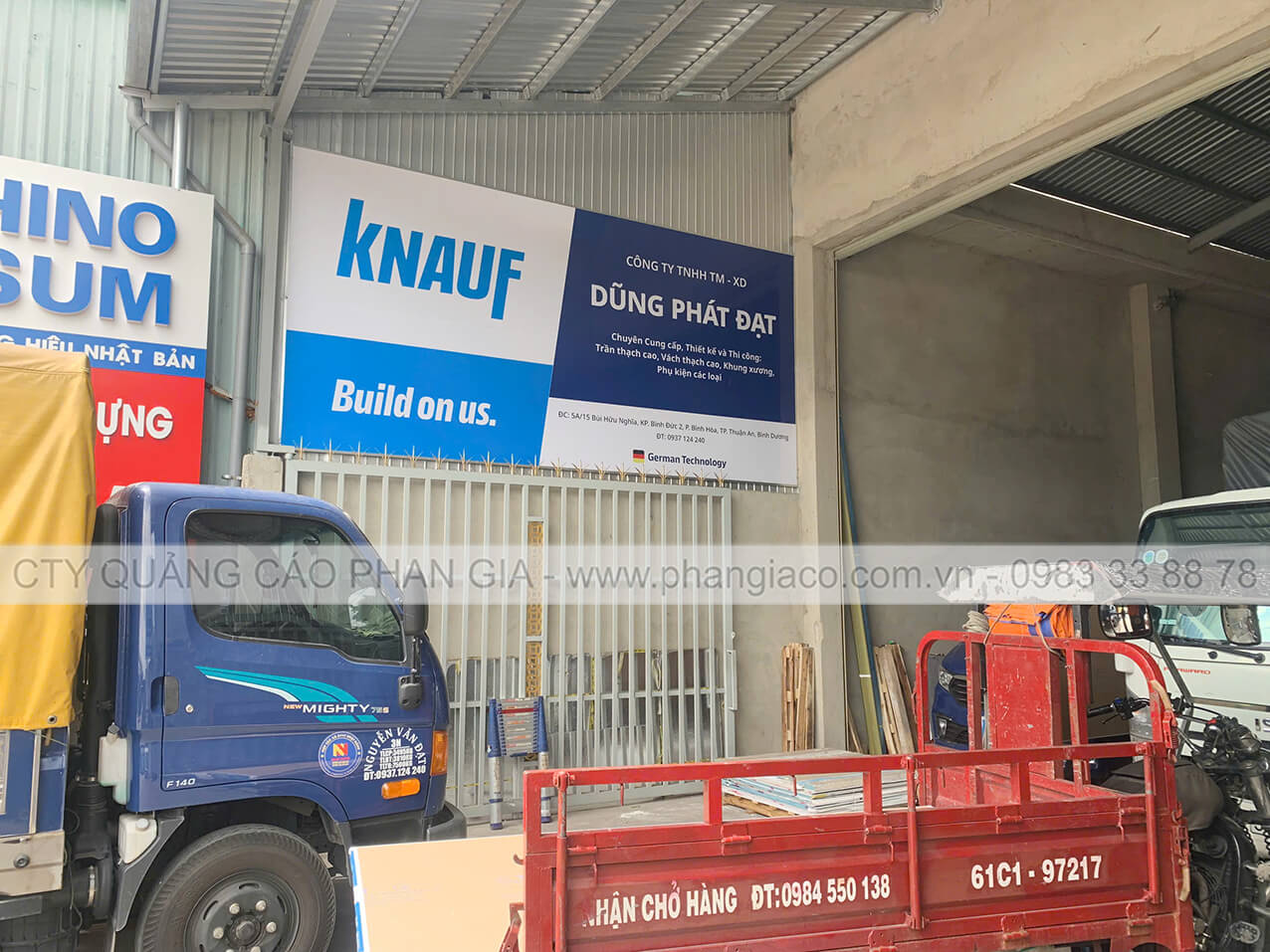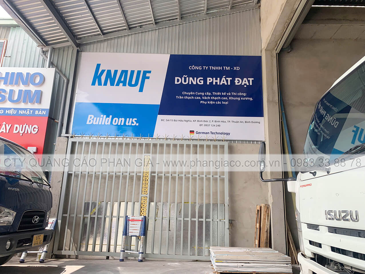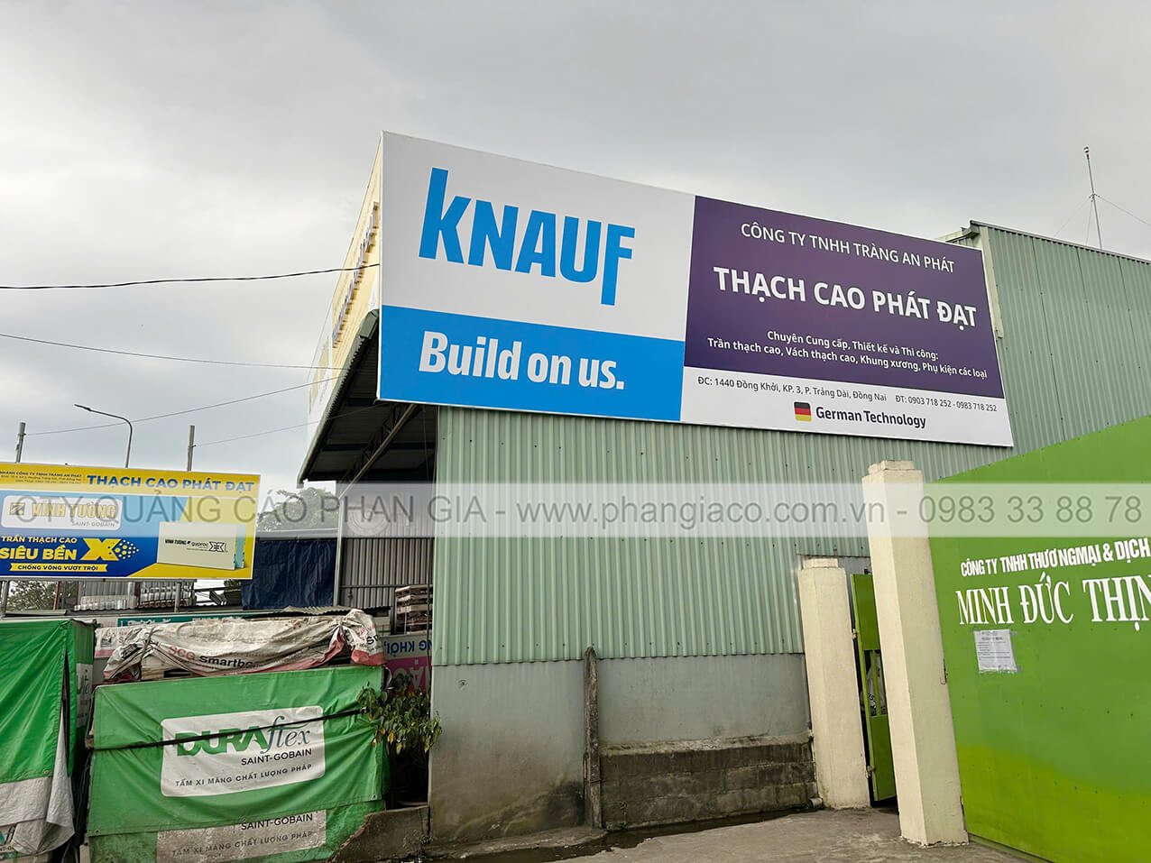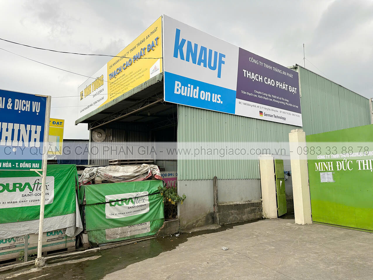 Bảng hiệu quảng cáo hiflex ốp tole nhà phân phối thạch cao Knauf được Phan Gia lắp đặt tại tỉnh Đồng Nai