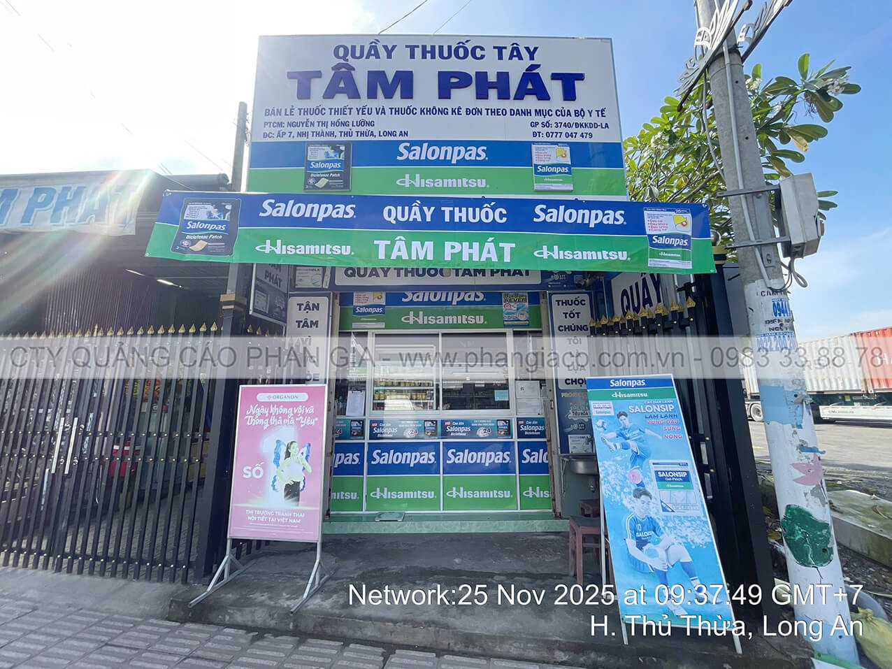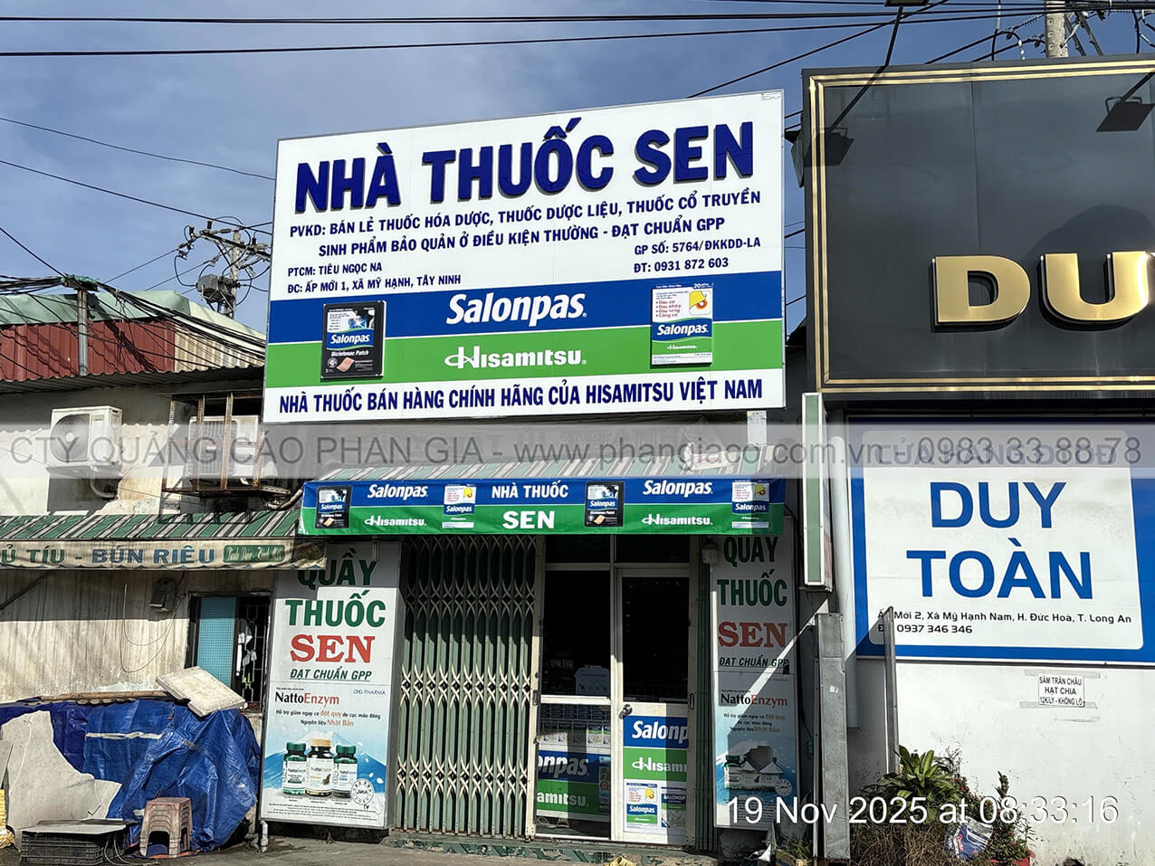 Bảng hiệu alu chữ nổi mica nhà thuốc tây Phan Gia khảo sát, thiết kế, sản xuất, vận chuyển và lắp đặt tại xã Mỹ Hạnh, Tây Ninh (huyện Đức Hòa, Long An cũ)